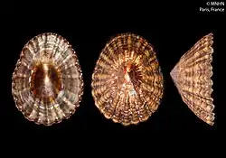 Se caracteriza por la escultura compuesta por fuertes cóstulas (costillas) radiales principales, anchas, rugosas o escamadas en la intersección con las líneas de crecimiento concéntricas. También presenta cóstulas secundarias que se intercalan entre las anteriores y, a medida que el animal crece, también terminan por engrosarse. En algunos casos las costillas son de color pardo oscuro resaltando sobre un fondo más claro de color grisáceo o pardo grisáceo.