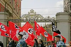 El actual Partido Nacional Bolchevique (PNB) se fundó en 1992 como Frente Nacional Bolchevique, una amalgama de seis grupos menores.[23] El partido siempre ha estado dirigido por Eduard Limónov. Limónov y Aleksandr Duguin trataron de unir a los radicales de extrema izquierda y extrema derecha en una misma plataforma.[24] Duguin consideraba a los nacional-bolcheviques como un punto intermedio entre comunistas y fascistas, y se veía obligado a actuar en la periferia de cada grupo. Las primeras políticas y acciones del grupo muestran cierta alineación y simpatía con los grupos nacionalistas radicales, aunque todavía manteniendo los principios de una forma de marxismo que Duguin definió como "Marx menos Feuerbach, es decir, menos evolucionismo y, a veces, apareciendo el humanismo inercial", pero en la década de 2000 se produjo una escisión que cambió esto hasta cierto punto. Esto hizo que el partido se moviera más a la izquierda en el espectro político ruso, y llevó a los miembros del partido a denunciar a Duguin y su grupo como fascistas. Posteriormente, Duguin desarrolló estrechos vínculos con el Kremlin y fue asesor del alto funcionario ruso Serguéi Naryshkin.[25][26][27]
