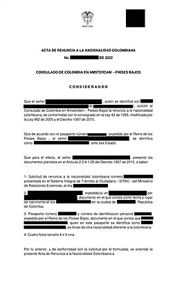 - ↑ «Recuperación de la nacionalidad Colombiana». Ministerio de Relaciones Exteriores de Colombia. 1993. Archivado desde el original el 26 de julio de 2014. Consultado el 28 de diciembre de 2010.