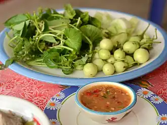 - Nam phrik tai pla (น้ำพริกไตปลา),[26] uno de sus ingredientes principales es el tai pla, una salsa utilizada en la cocina de Tailandia del Sur elaborada con las entrañas fermentadas de la caballa de cuerpo corto.[27]