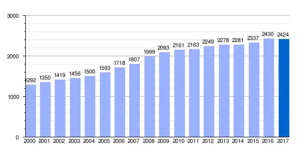 | Gráfica de evolución demográfica de Nanclares de la Oca[12] entre 2000 y 2017 |
