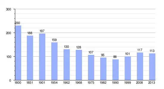 Los datos demográficos contemplados en este gráfico de la comuna de Nangeville[4] se han cogido de 1800 a 1999 de la página francesa EHESS/Cassini, y los demás datos de la página del INSEE.[5]