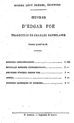 En 1847, Baudelaire conoció la obra de Poe, en la que encontró cuentos y poemas que, según él, existían desde hacía tiempo en su propio cerebro pero nunca habían tomado forma. Baudelaire vio en Poe a un precursor e intentó ser su homólogo francés contemporáneo.[1] Desde ese entonces hasta 1865, se dedicó en gran parte a traducir las obras de Poe; sus traducciones fueron ampliamente elogiadas. Baudelaire no fue el primer traductor francés de Poe: antes que él ya estaban presentes Gustave Brunet en 1844, Alphonse Borghers en 1845, Emile Forgues en 1846 e Isabelle Meunier en 1847;[2] pero sus traducciones estaban consideradas entre las mejores y siguen siendo referentes hasta el presente.