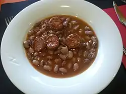 Las judías pintas con chorizo: Se hace un refrito de aceite con ajo, cebolla, pimiento, laurel, harina y pimentón. Se le añade agua, los pipos y el chorizo. Luego todo ello se cuece. Algunos añaden arroz. Una variante de este plato son las judías blancas con oreja.