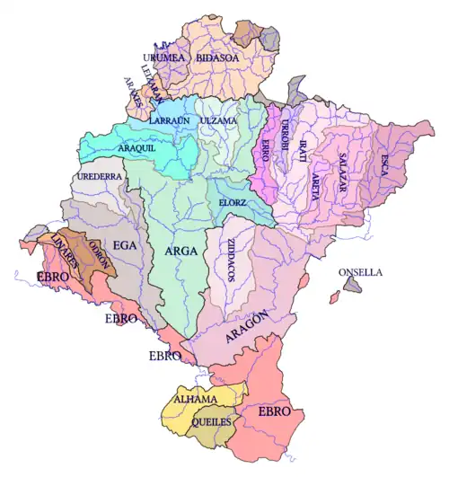 - La Vertiente Mediterránea ocupa aproximadamente 9239 km²[21] lo cual supone un 90 % del territorio navarro. Los ríos de esta vertiente vierten sus aguas al mar Mediterráneo a través del río Ebro el cual discurre unos 90 km² por la comunidad marcando en gran parte de este recorrido el límite con la comunidad autónoma de La Rioja. Este río recibe las aportaciones de los principales ríos de Navarra: El Arga, El Ega y el Aragón, como cuencas principales, además de otras tres menores, Linares, Alhama y Queiles, aportándole 4180 hm³ lo cual supone el 23 % del caudal medio.[30]