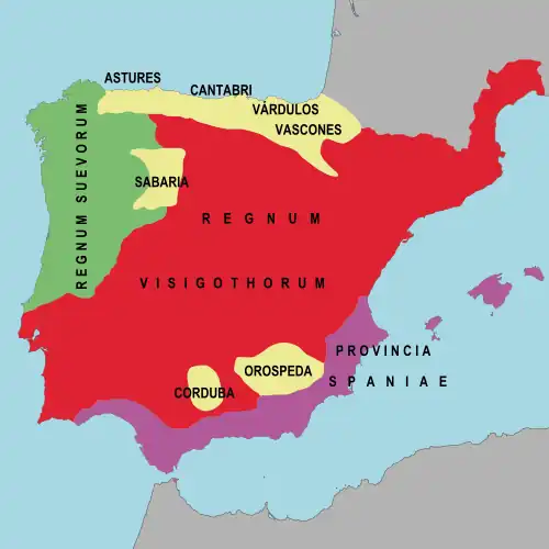 Con la caída de Roma, en la península entraron una serie de pueblos germánicos, entre ellos los visigodos. Estos acabaron creando un reino cristiano con capital en Toledo en la antigua Hispania romana. Los visigodos también entraron en contacto con los vascones, menos romanizados que la mayor parte de los habitantes del territorio peninsular.