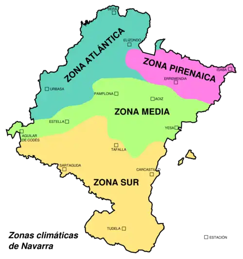 Condicionadas por el relieve, las zonas climáticas de Navarra son una mezcla de influencia montañesa de los Pirineos y mediterránea del valle del Ebro. Se distinguen cuatro zonas principales, habiendo una gran diferencia entre el clima del norte (mucho más húmedo y con precipitaciones frecuentes), al clima del sur (más mediterráneo y con temperaturas más altas y precipitaciones más esporádicas), pasando de los húmedos valles cantábricos del norte a las áridas y esteparias Bardenas Reales a orillas del río Ebro en pocos kilómetros. Las cuatro zonas serían:[33]