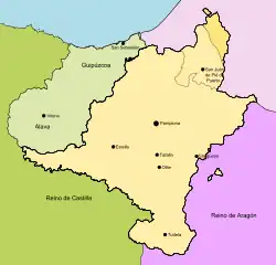 En su etapa de mayor expansión territorial, durante la Edad Media, el reino abarcó territorios atlánticos y se expandió más allá del río Ebro, hacia territorios situados en las actuales comunidades autónomas de Aragón, Cantabria, Castilla y León, La Rioja, País Vasco y las regiones administrativas francesas de Aquitania y Mediodía-Pirineos, en las antiguas provincias de Gascuña y Occitania. Las capitales vascas de Vitoria y San Sebastián fueron fundadas por el rey navarro Sancho VI el Sabio.