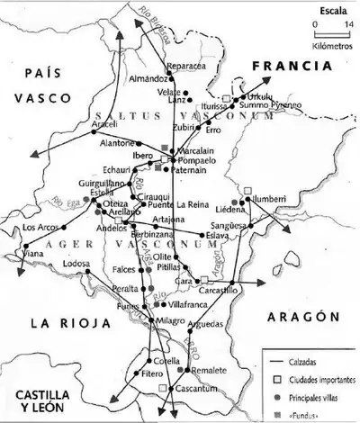 En la etapa prerromana, la zona que ocupa la actual Navarra estaba habitada por los vascones. La zona del valle del Ebro fue romanizada con la expansión del Imperio romano; no así la zona pirenaica. Tito Livio fue el primero en redactar una reseña historiográfica de los vascones, quienes se relacionaron con Roma de varias formas, incluso formando parte de sus ejércitos. Fueron los romanos quienes «dividieron» en dos el territorio vascón: llamaron Ager Vasconum a la zona llana, a orillas de los ríos Ebro, Ega, Arga y Aragón, caracterizándola con una vida basada en la agricultura; y Saltus Vasconum a la zona del norte, describiéndola como pastoril.