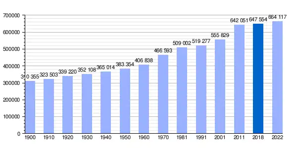 A lo largo del siglo XX la población de Navarra aumentó de 307 669 a 556 263 habitantes. El ritmo de crecimiento fue lento hasta que en los años 1960 se produjo un importante desarrollo industrial en Navarra, especialmente concentrado en el área metropolitana de Pamplona que convirtió a la comunidad foral en receptora de inmigrantes. Esta fuerte evolución se mantuvo hasta los años 1980, década en la cual se produjo una importante reducción de la tasa de natalidad que llegó a cifras preocupantes en los años 1990, particularmente en el periodo comprendido entre 1990 y 1996. A partir de ese año se vuelve a apreciar un fuerte incremento de la población debido a la llegada de inmigrantes extraeuropeos y la tasa de natalidad sigue desde entonces aumentando.[38]