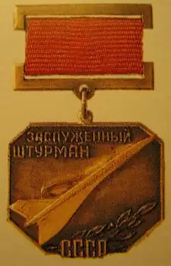 El título de Navegante Honorífico de la URSS, se otorgaba a los navegantes civiles de primera clase por sus logros sobresalientes en el desarrollo de la tecnología aeronáutica, del alto rendimiento en la educación y la capacitación del personal de vuelo y de largos periodos de tiempo sin incidencias en vuelo y por excelentes logros en aviación con respecto a la economía nacional.[1]