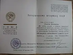 El título honorífico de Piloto de prueba de honor de la URSS se otorgó a navegantes de prueba tanto civiles como militares de primera clase de la industria aeroespacial y de defensa y las Fuerzas Armadas soviéticas, por varios años de trabajo creativo en el campo de las pruebas y la investigación de nuevas tecnologías en el sector de la aviación.[1]