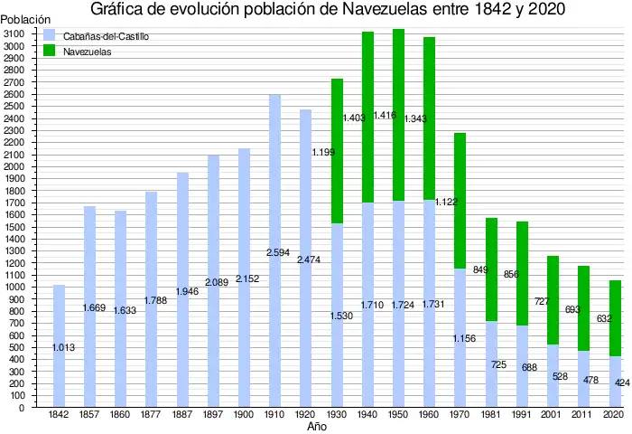 - ↑ Instituto Nacional de Estadística, España (ed.). «Población por sexo, municipio y edad, (grupos quinquenales) Navezuelas». Consultado el 26 de enero de 2021.
