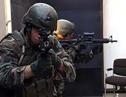 Alumnos practican ejercicios CQB durante un entrenamiento de cualificación SEALs.