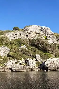 - Cuevas artificiales de la Edad del Hierro: Se trata de hipogeos de grandes dimensiones, con pilares y pilastras que compartimentan el espacio. La puerta suele ser rectangular, y presentan un patio exterior excavado en la roca. En general no se encuentran en lugares tan inaccesibles como las cuevas anteriores.[5] Se han documentado objetos de hierro como cuchillos, espadas o brazaletes; objetos de bronce como cadenas con colgantes, torques y brazaletes. También se han encontrado cuentas púnicas de pasta de vidrio procedentes de Ibiza. El uso ritual de la cala continuó después de la conquista romana.