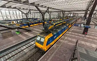 - Intercity: solo paran en estaciones más grandes y se introdujeron en la década de 1970 para proporcionar conexiones rápidas de trenes en todo el país. Los servicios interurbanos son operados por trenes de clase DDZ , VIRM e ICM . Una excepción es el servicio entre Den Haag Central y Eindhoven, que hace uso de la línea de alta velocidad entre Rotterdam y Breda, y es ofecido por vagones transportados por locomotoras Bombardier. En las líneas donde no operan servicios Sprinter, los trenes Intercity paran en todas las estaciones. Esto tiene lugar en las líneas entre Alkmaar - Den Helder, Bergen op Zoom - Vlissingen, Hoorn - Enkhuizen, Leiden - Woerden y Deurne - Venlo.