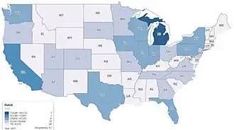 En el 2016 existían 4.044.507 de estadounidenses con ancestro neerlandés.[1] Según la encuesta sobre la comunidad estadounidense de 2021, aproximadamente 3,1 millones[2] de estadounidenses afirman tener una herencia neerlandesa total o parcial, mientras que 884 857[3] estadounidenses afirman tener una herencia neerlandesa total. En 2021, 113 634 estadounidenses neerlandeses nacieron en el extranjero (de los cuales el 61,5 % en Europa) y el 95,3 % de la población estadounidense neerlandesa total de 5 años o más solo hablaba inglés en casa.[4] Hoy en día, la mayoría de los estadounidenses neerlandeses viven en Míchigan, California, Montana, Minnesota, Illinois, Wyoming, Colorado, Dakota del Norte, Dakota del Sur, Nebraska, Kansas, Misuri, Indiana, Nueva York, Nueva Jersey, Wisconsin, Idaho, Utah, Iowa , Ohio, Virginia Occidental y Pensilvania.