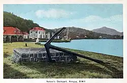 Un ancla en Nelson's Dockyard, con cuartos de oficiales y la Tienda de Lonas, Cordelería, y Ropa (inglés: Canvas, Cordage, and Clothing Store) detrás.