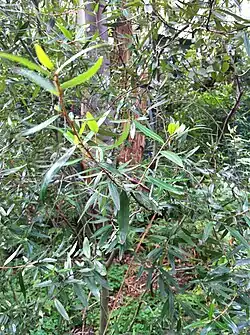 Es un arbusto o pequeño árbol que puede alcanzar hasta 10 metros de altura y tiene la corteza manchada. Las hojas son verdes brillantes de 30 a 80 mm de largo y 5 a 15 mm de ancho, y tienen escamas plateadas por el envés. Las inflorescencias se producen en grupos de 1 a 9 en forma de estrella con flores blancas en las axilas de las hojas en primavera.[2]