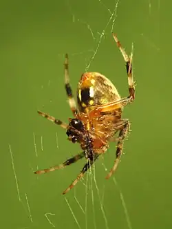 - ↑ BugGuide. 2017. Spotted Orbweaver (Neoscona domiciliorum). <http://bugguide.net/node/view/2034>