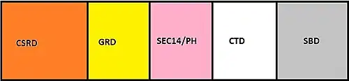 Es una proteína multidominio que consiste en dominio rico en cisteína-serina N-terminal (CSRD), un dominio central relacionado con GAP (GRD),[3] que incluye un dominio de unión a tubulina (TBD) en su extremo N, seguido de un dominio de interacción de fosfolípidos y proteínas, SecPH , y un dominio C-terminal (CTD)[4]