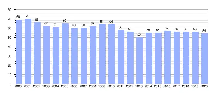 | Gráfica de evolución demográfica de Niévares[2] entre 2000 y 2020 |