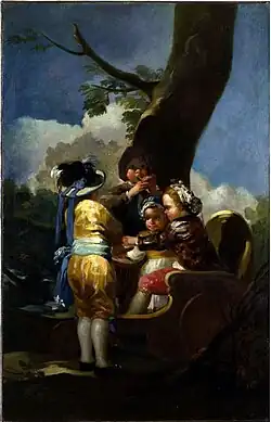 Estaba destinado a una sobrepuerta, de allí su formato. Entregado en enero de 1779, Goya percibió 1000 reales de vellón por él. Muestra un festivo ambiente madrileño, como El cacharrero y La acerolera. Nuevamente Goya toca el tema de la infancia, como ya lo había hecho en Niños jugando a soldados y Muchachos cogiendo fruta. En esta ocasión dos niños están montados en un carretón tocando instrumentos.