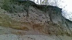La mayoría de las anidantes en madrigueras excavan un túnel horizontal en un barranco terroso vertical (o casi vertical), con una cámara al final del túnel para albergar los huevos.[36] La longitud del túnel varía en dependencia del sustrato y la especie; los aviones zapadores hacen túneles relativamente cortos que van de 50 a 90 cm,[37] por ejemplo, mientras que los de los periquitos excavadores pueden extenderse por más de 3 metros.[38] Algunas especies, incluyendo a las tamatías anidantes en el suelo, prefieren terrenos llanos o ligeramente ondulados, y excavan sus túneles de entrada en el suelo en ángulo.[39] En ejemplos más extremos, el barbudo capuchino cava un túnel chimenea vertical por más de un metro de profundidad, con su cámara del nido excavada hacia un lado a cierta altura sobre el fondo de la chimenea; de este modo ayuda a prevenir que el nido se inunde durante las fuertes lluvias.[40] El martín pescador del paraíso Tanysiptera sylvia cava su nido dentro del fango compactado de montículos activos de termitas, lo mismo en el suelo que en árboles.[35]