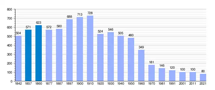 | Gráfica de evolución demográfica de Nieva de Cameros[5] entre 1842 y 2021 |