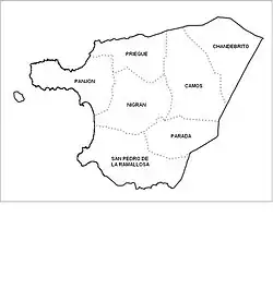 - ↑ a b Miralbes Bedera, Rosario; de Torres Luna, María Pilar; Rodríguez Martínez-Conde, Rafael (1979). «Nigrán». Mapa de límites de las parroquias de Galicia. Santiago de Compostela: Imprenta Paredes. p. 30. ISBN 8460014142.
