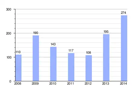| Gráfica de evolución de la deuda viva del ayuntamiento entre 2008 y 2014 |