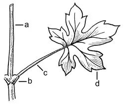 - ↑ a b González, A.M. & Arbo, M.M. «Organización del cuerpo de la planta. Tema 2: Hoja, 2.4. Pecíolo y base foliar». Morfología de Plantas Vasculares. Argentina: Universidad Nacional del Nordeste. Archivado desde el original el 9 de diciembre de 2010. Consultado el 10 de septiembre de 2010.