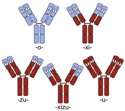 Estos anticuerpos no humanos son reconocidos como extraños por el sistema inmune humano y se pueden borrar rápidamente del cuerpo, provocar una reacción alérgica, o ambos.[12][13] Para evitar esto, las partes del anticuerpo se pueden sustituir por secuencias humanas de aminoácidos, o se pueden diseñar anticuerpos humanos puros. Si la región constante se reemplaza con la forma humana, el anticuerpo se denomina quimérico y la substem utilizada es -xi-. Parte de las regiones variables también puede estar sustituidas, en cuyo caso se llama humanizadas y se utiliza -zu-; típicamente, todo se sustituye excepto las regiones determinantes de la complementariedad (CDR), los tres bucles de secuencias de aminoácidos en el exterior de cada región variable que se une a la estructura objetivo. Parcialmente los anticuerpos quiméricos humanizados y en parte utilizan -xizu-. Estos tres substems no indican las especies foráneas utilizadas para la producción. Por lo tanto, el anticuerpo quimérico humano/de ratón basiliximab termina en -ximab al igual que el anticuerpo humano/de macaco gomiliximab. Los anticuerpos humanos puros utilizan -u-.[2]