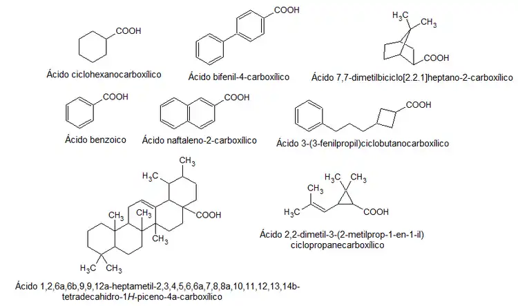 Cuando el grupo carboxilo se encuentra unido a una estructura cíclica, se menciona la palabra ácido, seguida del nombre del ciclo y se concluye yuxtaponiendo la palabra "carboxílico". El ácido bencenocarboxílico se denomina comúnmente como ácido benzoico.