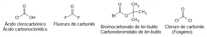 El ácido carbónico puede tener varios derivados que se forman por reemplazo de un grupo -OH por un halógeno. Los ácidos monosustituídos son los ácidos halocarbónicos (O ácidos halofórmicos, o ácidos carbonohalídicos). Sus ésteres son los halocarbonatos de alquilo. Los productos de doble sustitución se nombran como halogenuros de carbonilo.