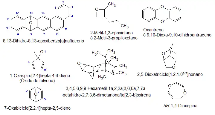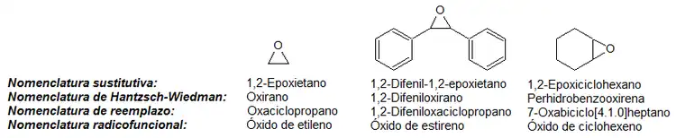 - Estos compuestos pueden ser nombrados por la nomenclatura de reemplazo con el prefijo "oxa-" del ciclopropano.