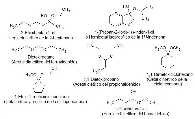 - a) Nomenclatura radicofuncional: Se considera que los hemiacetales y acetales son derivados de adición de una o dos moléculas de alcohol en un grupo carbonilo, por lo que el compuesto se puede nombrar como "(hemi)(a)cetal" seguido del adjetivo (que consta de la raíz nominal del alcohol y el sufijo "-ico") y se menciona el compuesto carbonílico del que proviene.