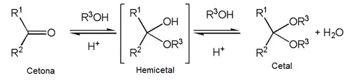 Un carbono enlazado con un sustituyente alcoxilo y otro hidroxilo se denomina hemicetal R2-C(OH)OR'(hemiacetal cuando el carbono geminal además contiene un hidrógeno como sustituyente R-CH(OH)OR'). Dos grupos alcoxilo (idénticos o distintos) sobre el mismo carbono general el grupo cetal R2C(OR')OR(acetal cuando el carbono geminal además contiene un hidrógeno como sustituyente R-CH(OR')OR).[39]