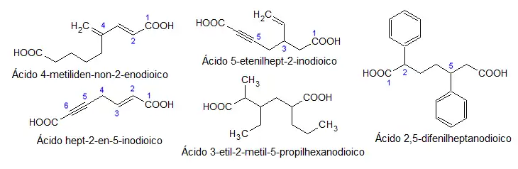 - Ácidos dicarboxílicos: Cuando dos grupos carboxilo están presentes en una cadena principal, el ácido es nombrado como "ácido alcanodioico", "ácido alquenodioico", etc.[4]