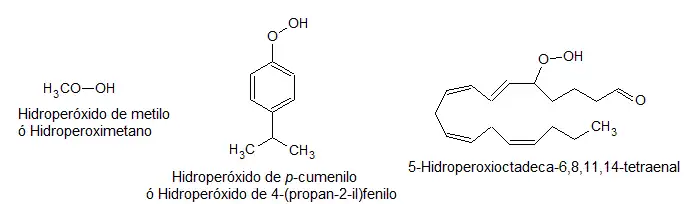 - Hidroperóxidos. La nomenclatura radicofuncional menciona a estos compuestos como hidroperóxidos de alquilo, siempre y cuando el grupo alquilo sea de mención simple. En casos donde el hidroperóxido es de menor prioridad, se menciona al sustituyente - OOH como "hidroperoxi-".