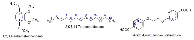 - Poliéteres y cetales: Un poliéter puede ser nombrado mediante cualquiera de los sistemas de nomenclatura (sustitutivo, multiplicativo o de reemplazo). Debe elegirse el sistema que brinde la mayor simplificación en el nombre.