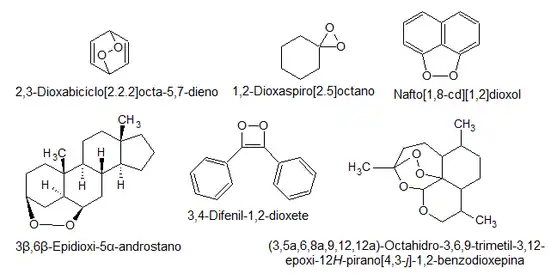 - (c) Los peróxidos heterocíclicos pueden mencionarse por nomenclatura de reemplazo. Lo policiclos que tienen un peróxido bivalente como puente se denominan endoperóxidos. Cuando se desea por el uso del prefijo "epidioxi-" cuando el grupo-OO-forma un puente entre dos átomos de carbono de un anillo o un sistema de anillo.