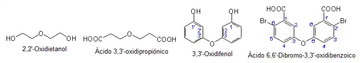Dos unidades moleculares idénticas unidas por un oxígeno pueden ser mencionadas por nomenclatura multiplicativa (se cita el prefijo "oxi-" si la unidad molecular tiene un grupo funcional con mayor prioridad de mención y el nombre de la molécula antecedido por el prefijo numeral "bis-").[38]