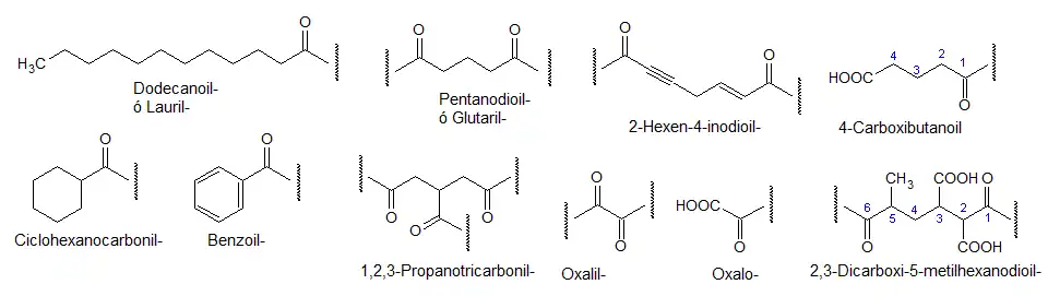 Los sustituyentes generados a partir del ácido carbónico se pueden nombrar de acuerdo a lo que se muestra en la siguiente tabla: