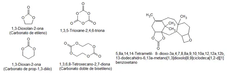 - Los carbonatos endocíclicos se denominan como lactonas carbónicas. De acuerdo al caso, se pueden nombrar como carbonatos de alquileno o como 2-oxo-1,3-dioxacicloalcanos (de acuerdo al sistema de nomenclatura de Hantzsch-Widman).