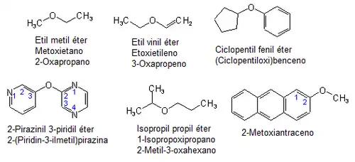 - Monoéteres asimétricos: Para éteres con sustituyentes que tengan nombres simples, se mencionan dichos nombres separados por espacios en orden alfabético, seguidos de la palabra “éter”. Se puede utilizar también nomenclatura de reemplazo. La nomenclatura sustitutiva puede denominar al éter como un alcoxialcano.