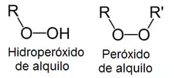 El dioxidano H2O2 (peróxido de hidrógeno) puede presentar derivados de monosustitución denominados hidroperóxidos de alquilo (R—O—OH) o derivados de disustitución denominados peróxidos de alquilo (peréteres, R—O—O—R').[40]