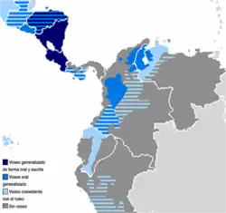 El español hablado en el norte de Sudamérica presenta muchas variaciones regionales, con similitudes que reflejan migraciones, contactos culturales y geografía. Una característica distintiva es el voseo, el uso del pronombre "vos" en lugar de "tú" o "usted" para la segunda persona del singular. Este fenómeno es particularmente prominente en los Andes de Colombia (especialmente en la región paisa, Valle del Cauca y Nariño), en los Andes ecuatorianos (donde coexiste con el tuteo y el ustedeo) y en la región occidental de Venezuela (estados como Zulia y Trujillo).[59][60] Aunque las conjugaciones verbales y el alcance de su uso varían (desde un voseo verbal completo hasta uno meramente pronominal), su presencia en estas zonas andinas establece un vínculo lingüístico, distinguiéndolas de las regiones costeras y de otras áreas del continente donde predomina el tuteo.[60]