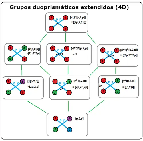 Los grupos de rango cuatro también definen algunos de los grupos del papel pintado bidimensionales, como casos límite de los grupos de duoprismas de cuatro dimensiones: