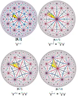 para el grupo triangular (p q r). Si los órdenes de ramificación son iguales, se pueden agrupar como un exponente según la duración del ciclo entre paréntesis, como [(3,3,3,3)] = [3[4]], que representa el diagrama de Coxeter ![]()